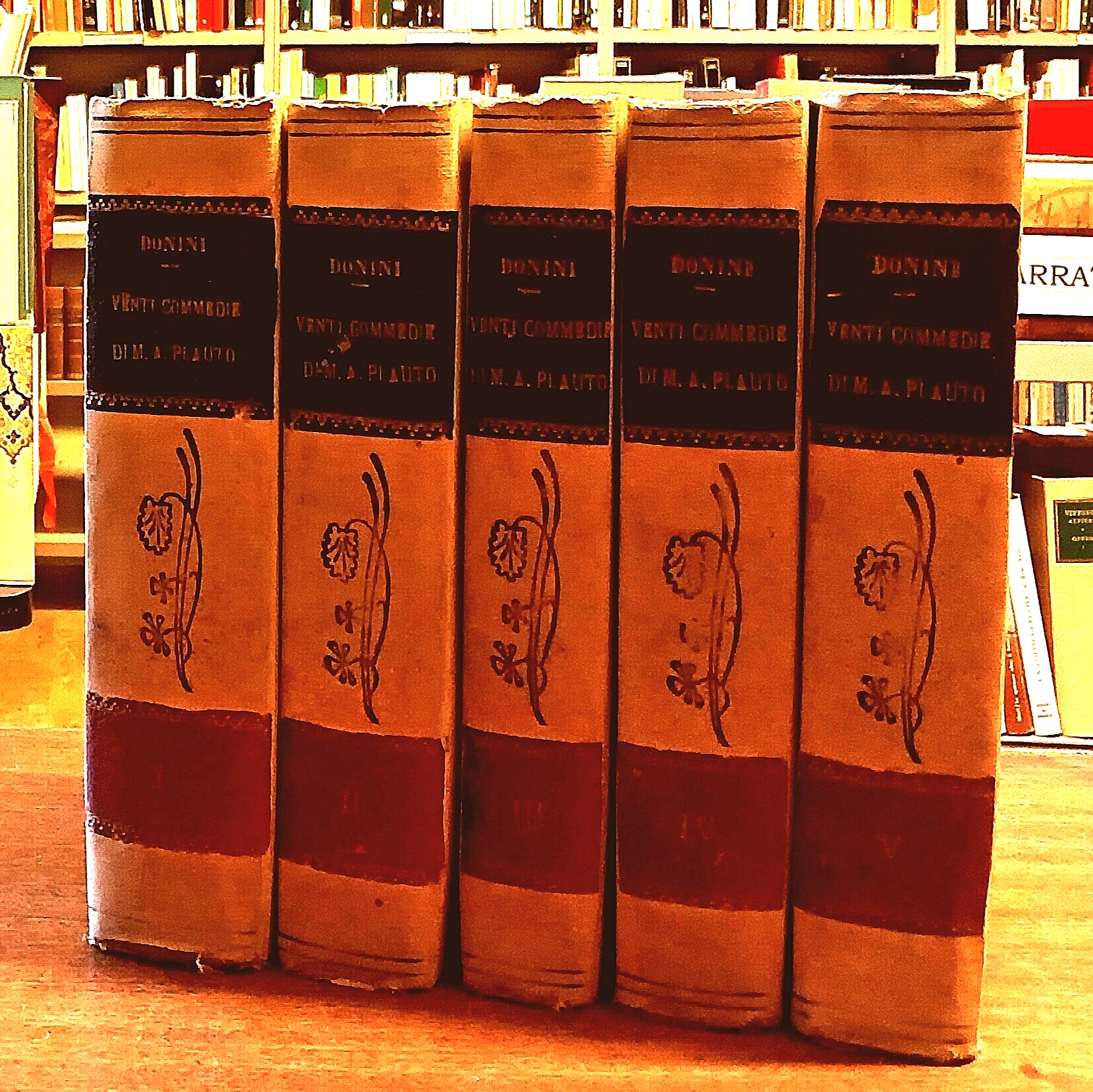 (Classici greci e latini) PLAUTO Tito Maccio: LE VENTI COMMEDIE DI MARCO ACCIO PLAUTO. Volgarizzate da Pierluigi Donini, CREMONA, TIPI DELL'EREDE MANINI, 1846, pagg. 613; 510; 417; 513; 558. Opera completa in 5 volumi. Testo latino a fronte. Legature editoriali in mezza tela. Titoli ai dorsi. Ottimo stato. Catalogo: 44056 € 150.00 Acquista il libro